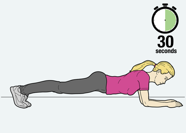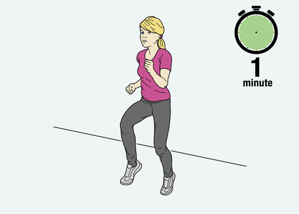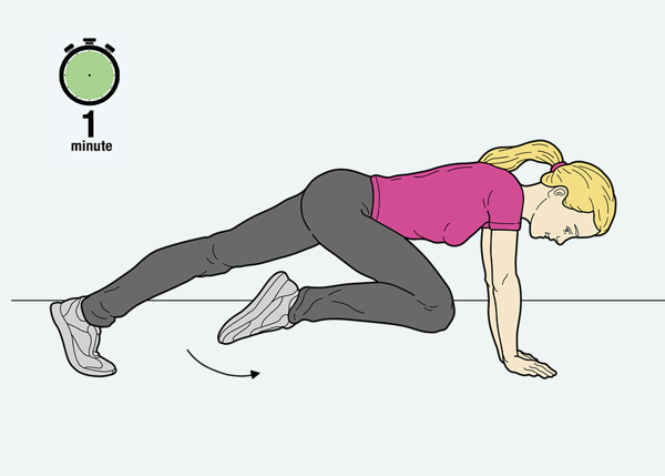 4. Now switch knees. Alternate, pulling the knees in right, left, right, left, to create a ‘running’ motion. This is called the 'mountain climber'. Do this for one minute.