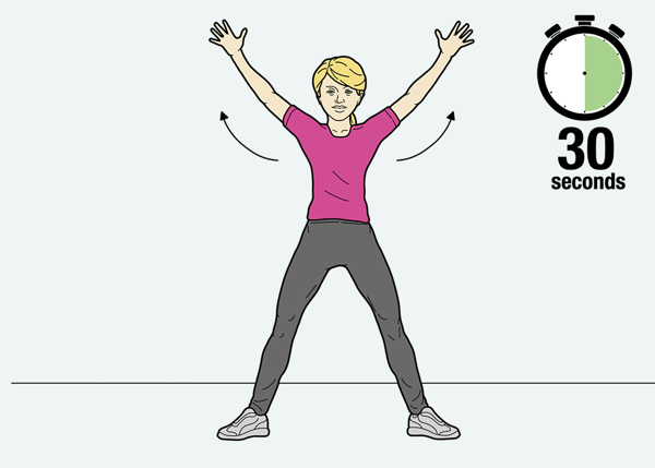 3. Spring off your bent legs, throwing your arms into the air. Repeat this squat and jump action for 30 seconds.