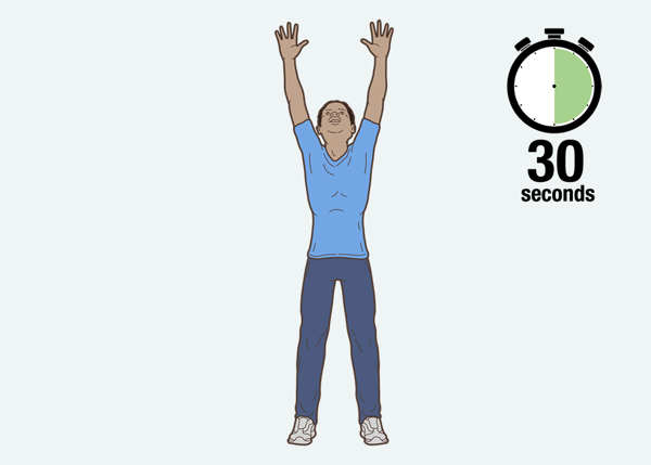 1. Stand up tall. Put both arms up and reach up as far as you can.
