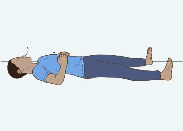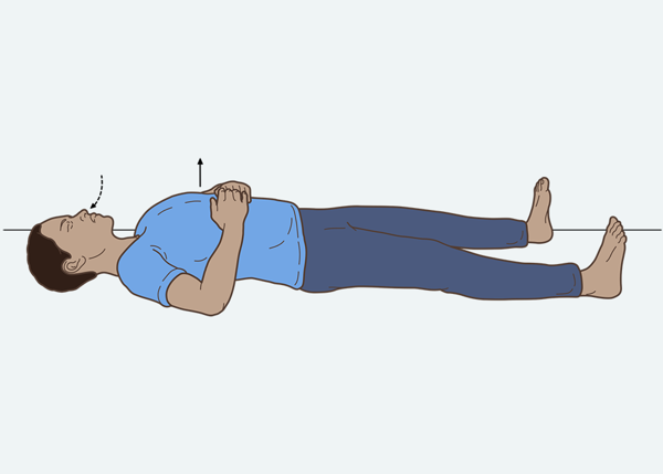1. فرش پر ایک جگہ پر لیٹ جائیں، اپنے بازوؤں کو آرام سے اپنے پہلو میں رکھے ہوئے۔ اگر آپ چاہیں تواپنی آنکھیں بند کر سکتے ہیں۔ آہستہ سے سانس لیں۔