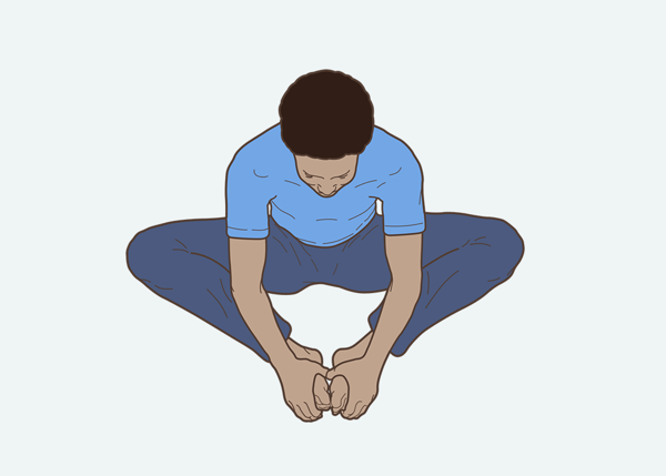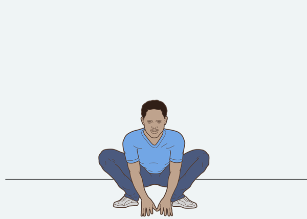 2. ناک کے ذریعے سانس لیتا ہواشخص۔ سیدھا کھڑے ہو کراپنے پیروں کو کولہے کی چوڑائی سے تھوڑازیادہ فاصلے پر اور تھوڑا سا ایک طرف نکال کررکھیں۔ مینڈک کی پوزیشن میں اکڑوں ہوکر بیٹھیں اور اپنے ہاتھوں کو اپنی ٹانگوں کے درمیان زمین پر رکھیں۔