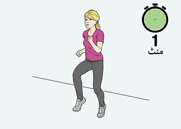 2. ناک کے ذریعے سانس لیتا ہواشخص۔ اب، ایک منٹ کے لیےاسی جگہ پر واقعی تیزی سے جاگنگ کریں۔