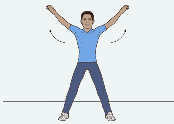 1. لمبے کھڑے ہوں، سر اونچا کریں اورخود کو ناف کی جانب کھینچیں۔ ا پنے بازوؤں اور ٹانگوں کو ایک ستارے کی شکل میں پھیلائیں۔