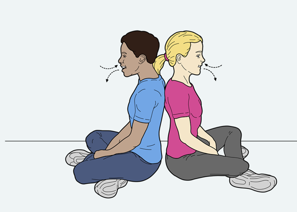 1. ایک ساتھی تلاش کریں اور فرش پر ٹانگیں آلتی پالتی کرکے پشت سے پشت لگا کر بیٹھیں۔ سیدھے ہو کر بیٹھیں اور اور اگر آپ چاہیں تو آنکھیں بند رکھیں۔