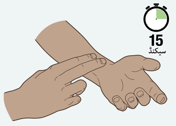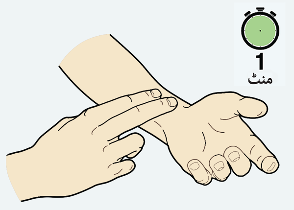 2. ناک کے ذریعے سانس لیتا ہواشخص۔ اپنے دوسرے ہاتھ کی پہلی دو انگلیوں سے، اپنے انگوٹھے کے اوپر سے نیچے کی طرف اس وقت تک آہستہ سے تھپتپھائیںجب تک کہ آپ کی انگلیاں آپ کی کلائی تک نہ پہنچ جائیں۔