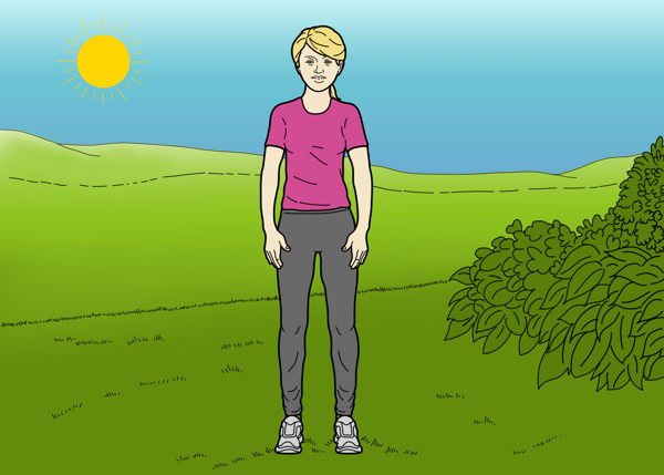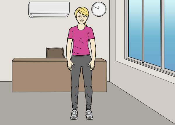 2. ناک کے ذریعے سانس لیتا ہواشخص۔ اپنے پیروں کو ملا کرکھڑے ہوں، گھٹنوں کو تھوڑا سا جھکا کر اور بازو اپنی اطراف میں رکھتے ہوئے۔