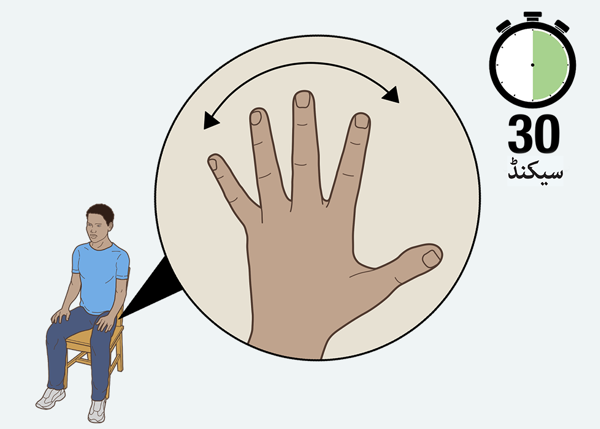 2. ناک کے ذریعے سانس لیتا ہواشخص۔ اب اپنی انگلیوں کو جتنی چوڑی ہو سکے پھیلائیں اور انہیں 30 سیکنڈ تک اسی طرح پھیلا کر رکھیں۔ پھر انہیں واپس آرام کی حالت میں لے آئیں، تاکہ وہ دوبارہ آرام کریں۔