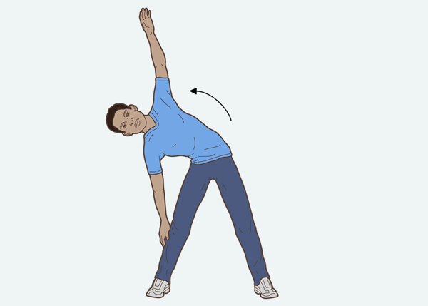 2. ناک کے ذریعے سانس لیتا ہواشخص۔ جب آپ آہستہ آہستہ ایک بازو اپنے سر پر پھیلارہے ہوں تو اپنی ناک سے سانس لیں ۔ اپنے دوسرے بازو کو اپنی ٹانگ کے نچلےحصےکیطرف آہستہ سےلےجائیں۔