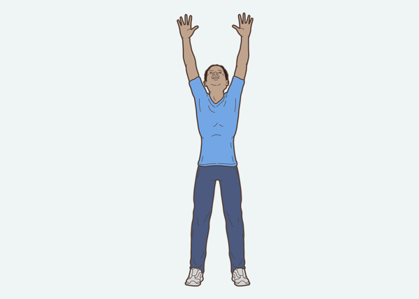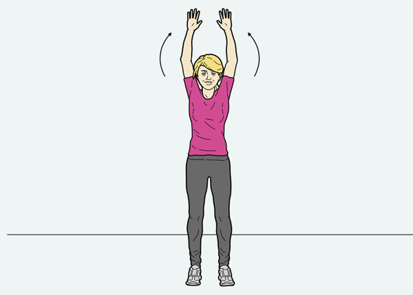 1. سیدھا کھڑے ہو جائیں۔ دونوں بازو اوپر رکھیں اور جہاں تک ہو سکے انہیں اوپر تک لے جائیں۔