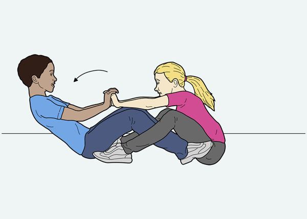 4. اپنے ہاتھوں کو اپنے ساتھی کے ہاتھوں کے مدمقابل دھکیلیں جب آپ 'روئنگ موشن' میں پیچھے اور آگے لڑھکتے ہیں۔
