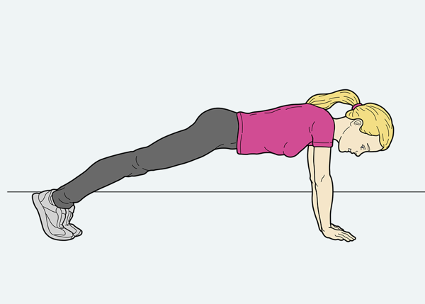 2. ناک کے ذریعے سانس لیتا ہواشخص۔ فرش پر ہاتھ اور پیروں کے ساتھ اور اپنے جسم کو سیدھا رکھ کرایک تختے کی پوزیشن میں نیچے ہوجائیں۔