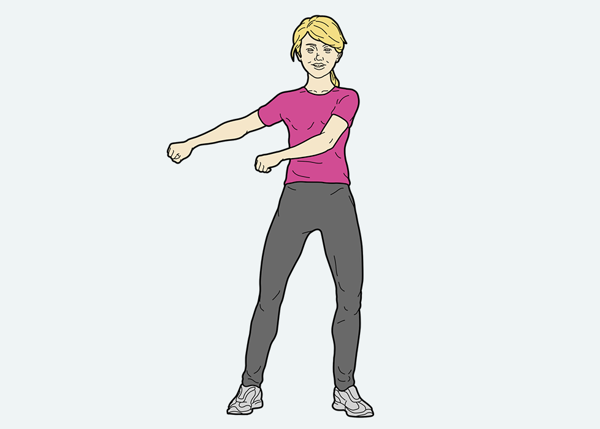 2. ناک کے ذریعے سانس لیتا ہواشخص۔ اپنے دائیں ہاتھ کو اپنی پیٹھ کے پیچھے سےگھمائیں اور اپنے بائیں کو اپنے سامنےسے۔ انہیں واپس باہر اور اپنے پورے جسم کےگرد جھولے کے طور پر حرکت دیں۔