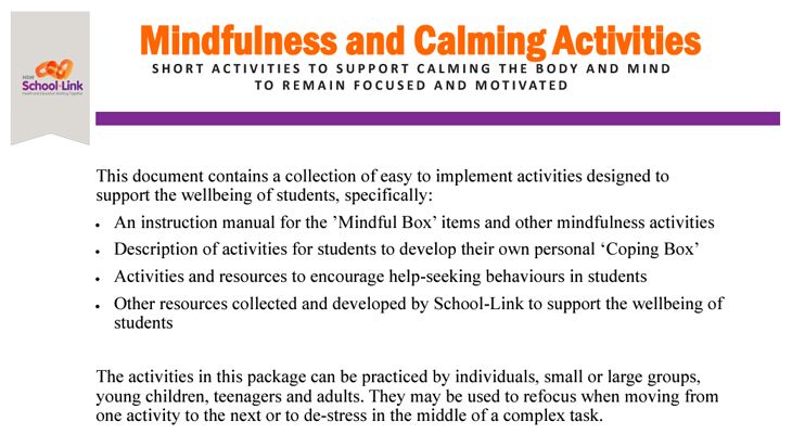 This PDF contains a collection of easy to implement activities designed to support the wellbeing of students. It includes an instruction manual for the ’Mindful Box’ items and other mindfulness activities, a description of activities for students to develop their own personal ‘Coping Box’, and activities to encourage help-seeking behaviours in students.